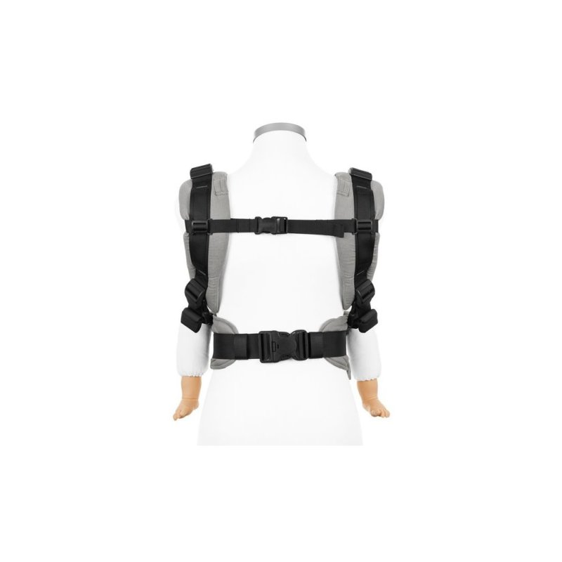 Můžete v něm nosit dítě na břiše nebo na zádech. Polstrovaný bederní pás lze dotáhnout na obou stranách má bezpečnostní pojistku a dodatečnou gumičku. Rozkládá váhu dítěte na boky a odlehčuje ramenům. Ploché pásy na zesílených ramenních popruzích jsou nastavitelné, což ještě zvyšuje komfort. Mezi ramenními popruhy je přezka, aby nesklouzávaly z ramen.