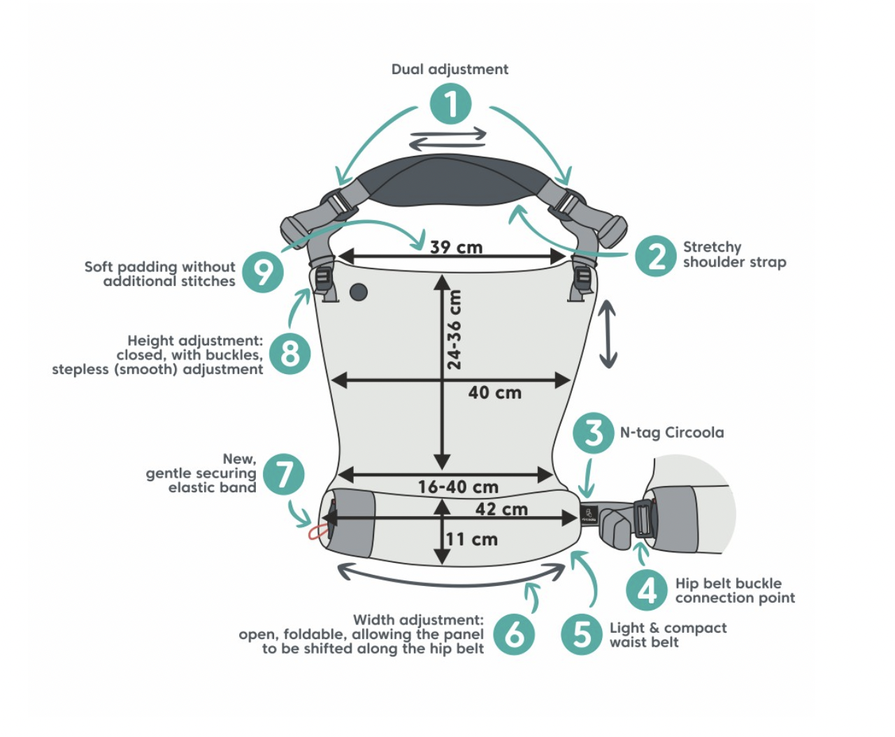 - Snadné přizpůsobení: Stabilní a pohodlný nastavitelný bederní pás a flexibilní ramenní popruhy umožňují snadné a rychlé přizpůsobení nosiče rodičům různých tělesných typů.